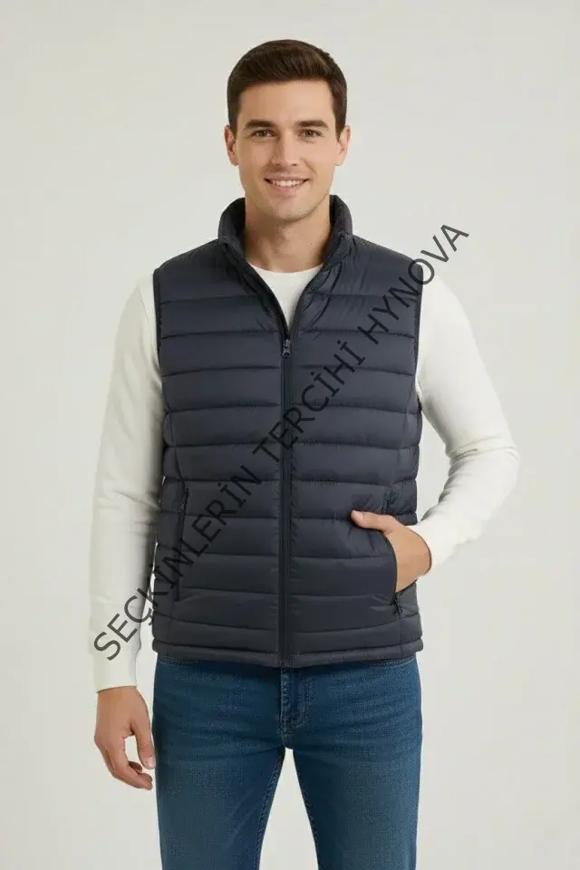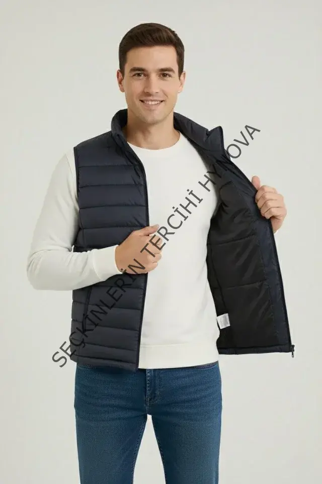 Erkek Şişme Fermuarlı Yelek Su Itici Kapitone Astarlı Kumaş Cepli Hafif Kışlık Spor Rahat Kalıp - Lacivert