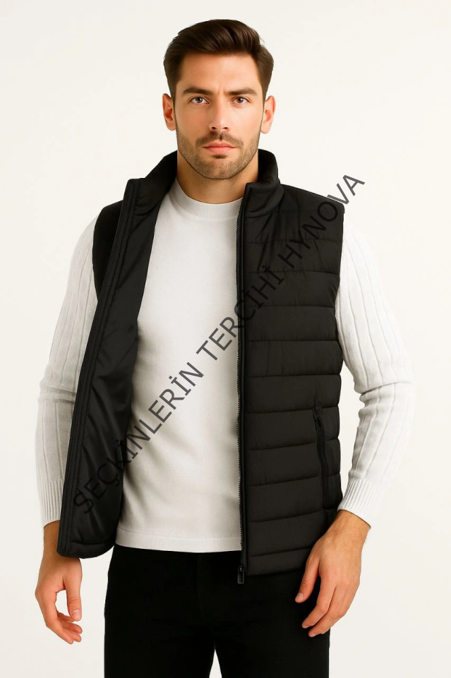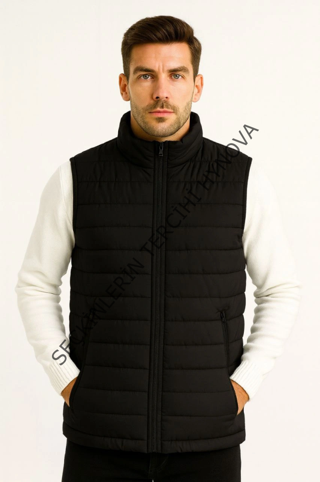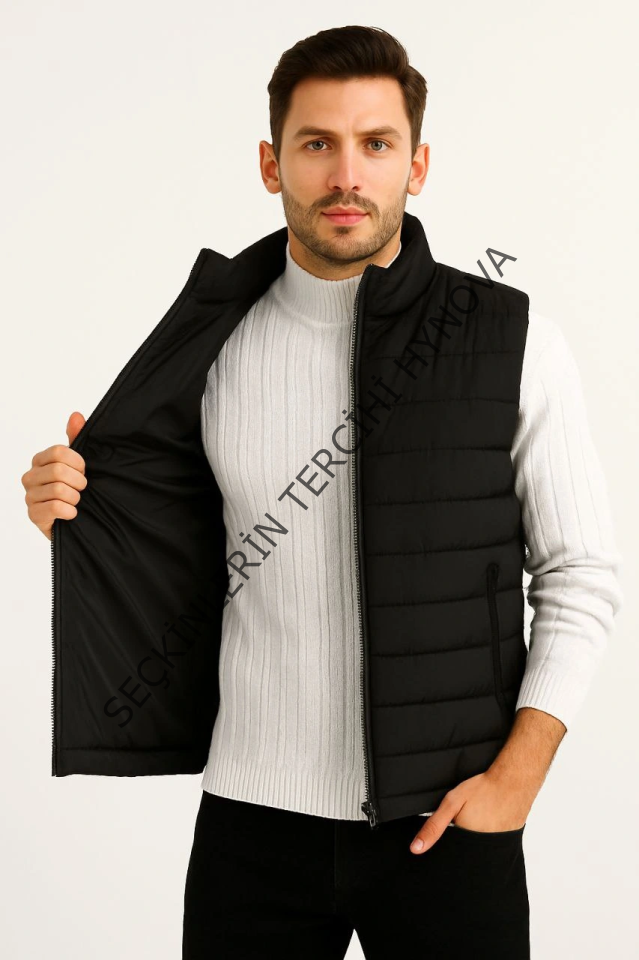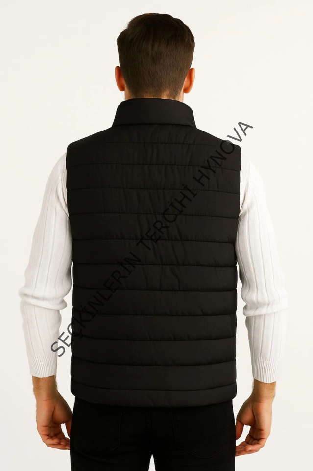 Erkek Şişme Fermuarlı Yelek Su Itici Kapitone Astarlı Kumaş Cepli Hafif Kışlık Spor Rahat Kalıp - Siyah