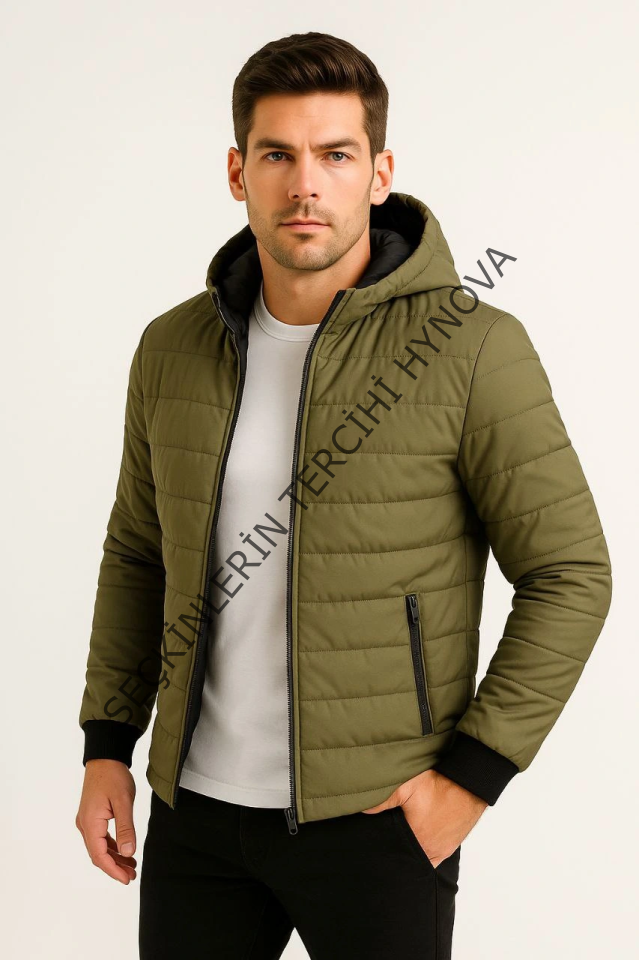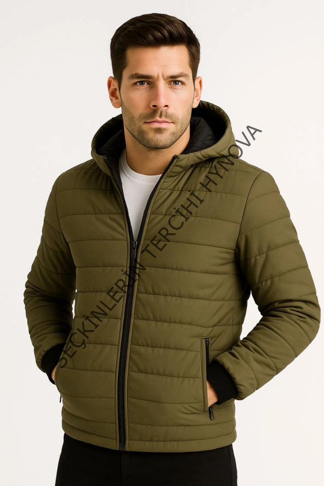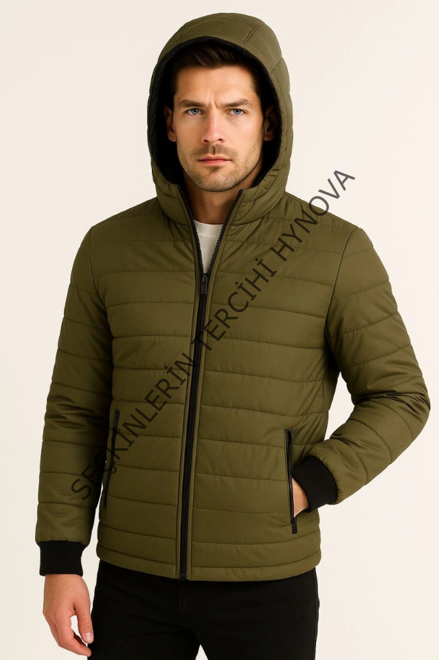 Erkek Şişme Kapüşonlu Fermuarlı Mont Su Itici Kapitone Astarlı Kumaş Cepli Kışlık Rahat Kalıp - Haki
