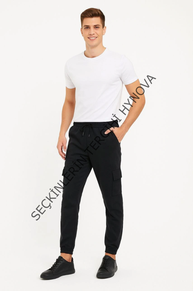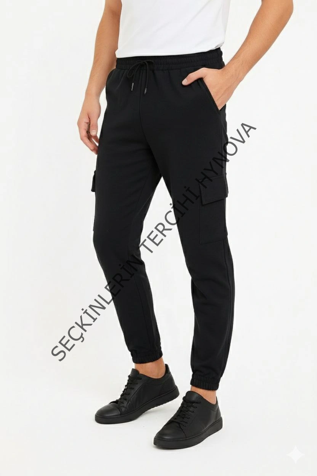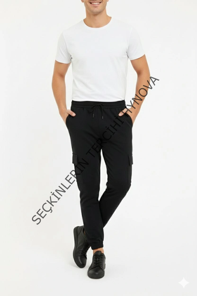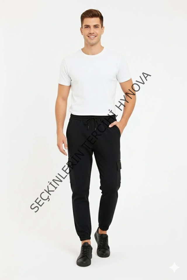 Erkek Siyah Jogger Eşofman Altı Rahat Kalıp, Kargo Cepli, Lastikli Paça, Günlük Spor Pantolon - Siyah