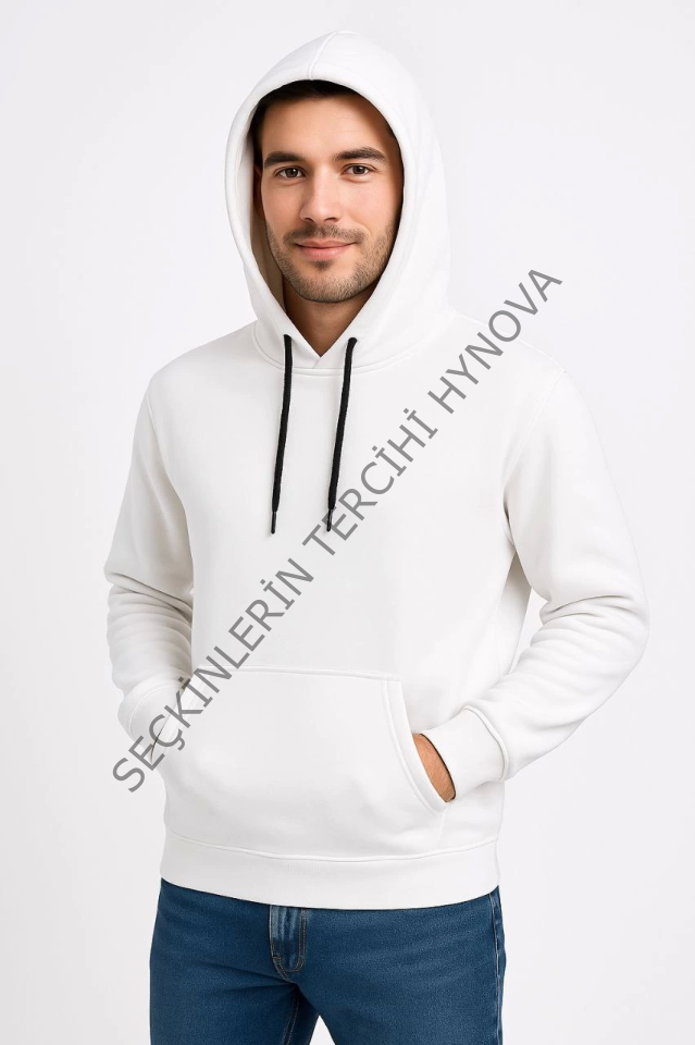 Erkek Üç İplik Kapüşonlu Kanguru Cepli SweatShirt Hoodie - Beyaz