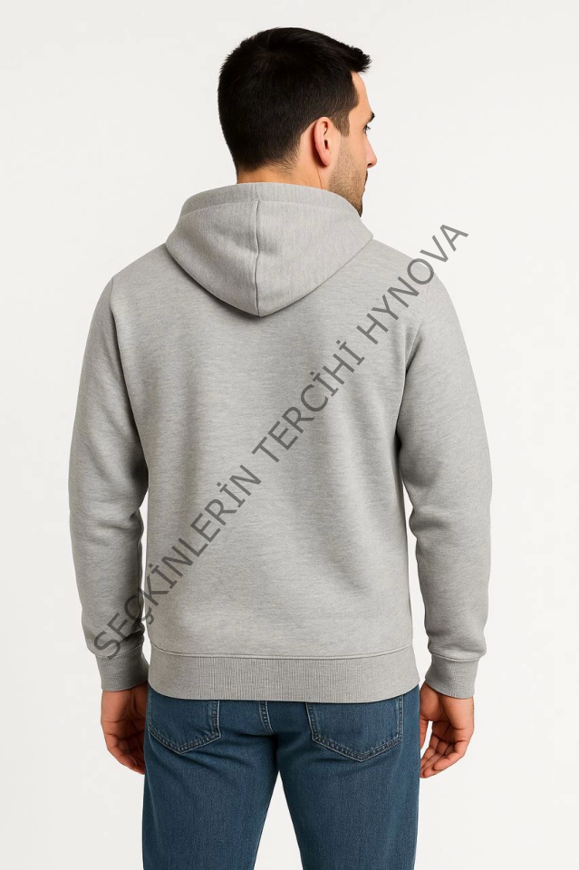 Erkek Üç İplik Kapüşonlu Tam Fermuarlı Kanguru Çepli SweatShirt Hoodie - Gri