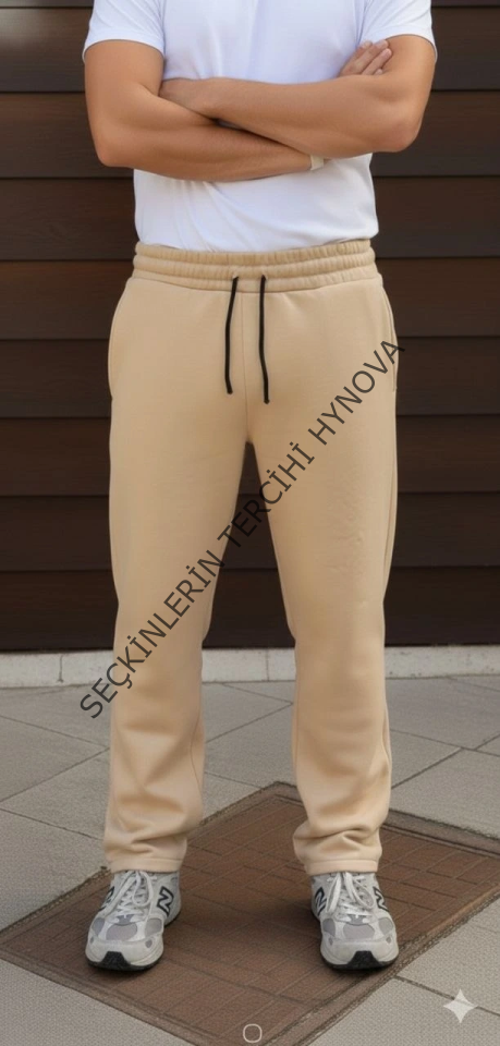 Erkek Üç Iplik Kışlık Pamuklu Ovarsize Bağcıklı Düz Paça Cepli Eşofman Altı Spor Rahat Model - Bej