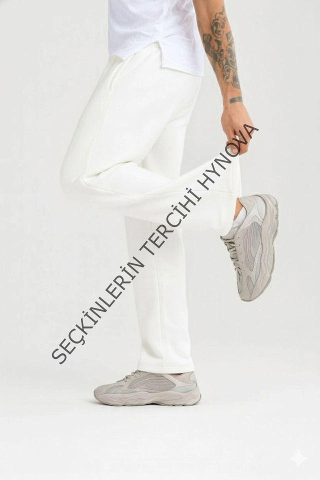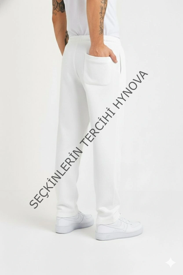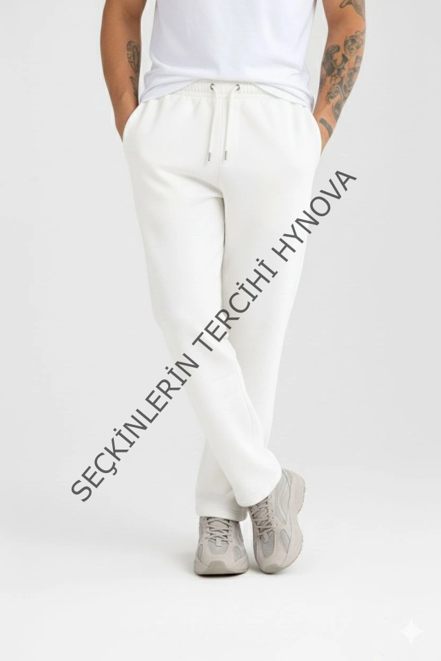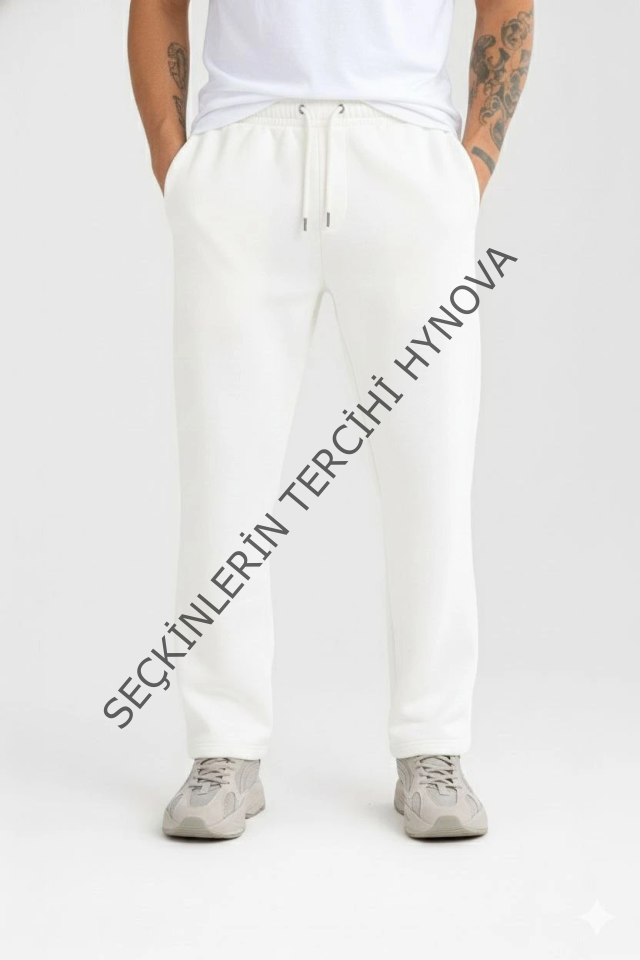 Erkek Üç Iplik Kışlık Pamuklu Ovarsize Bağcıklı Düz Paça Cepli Eşofman Altı Spor Rahat Model - Beyaz