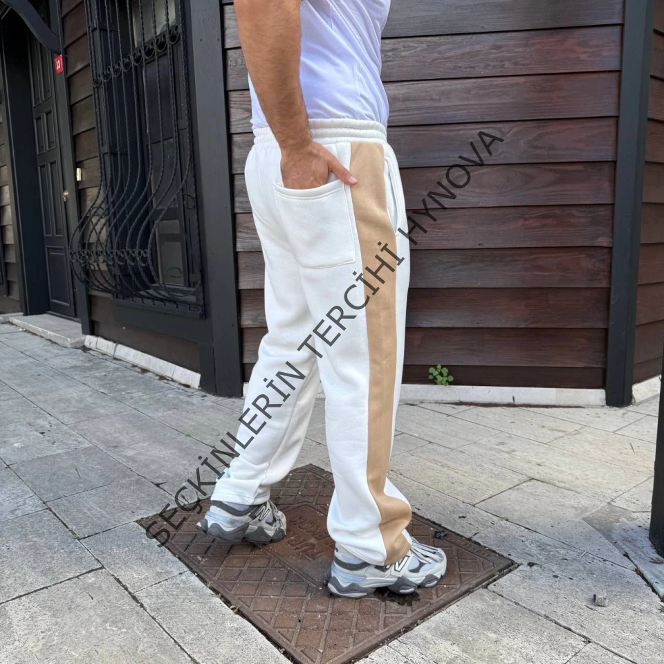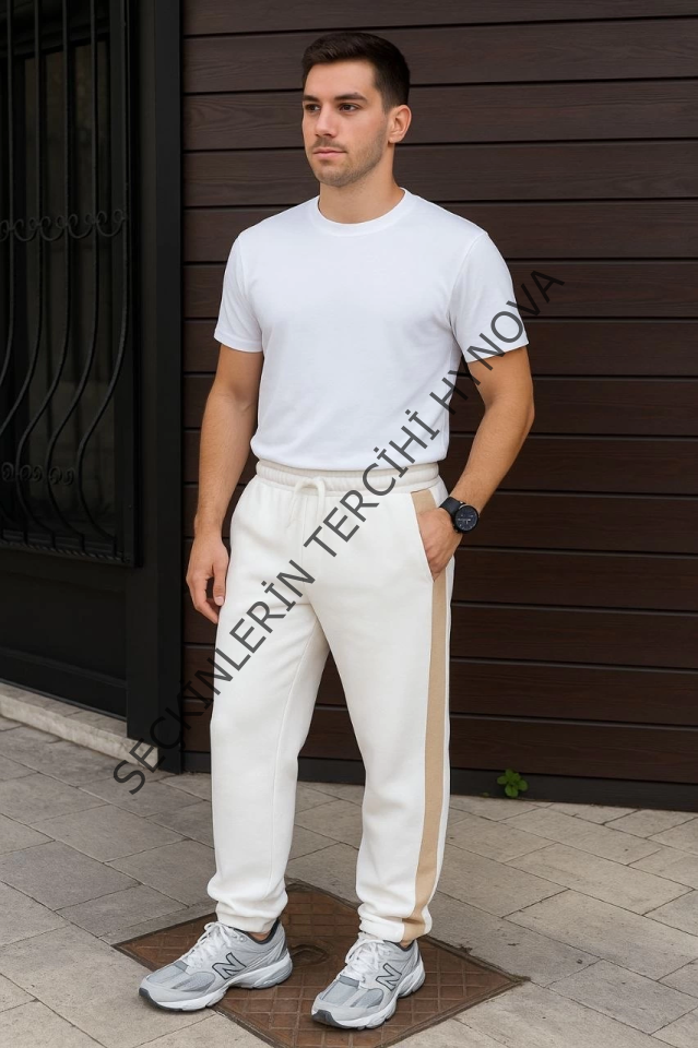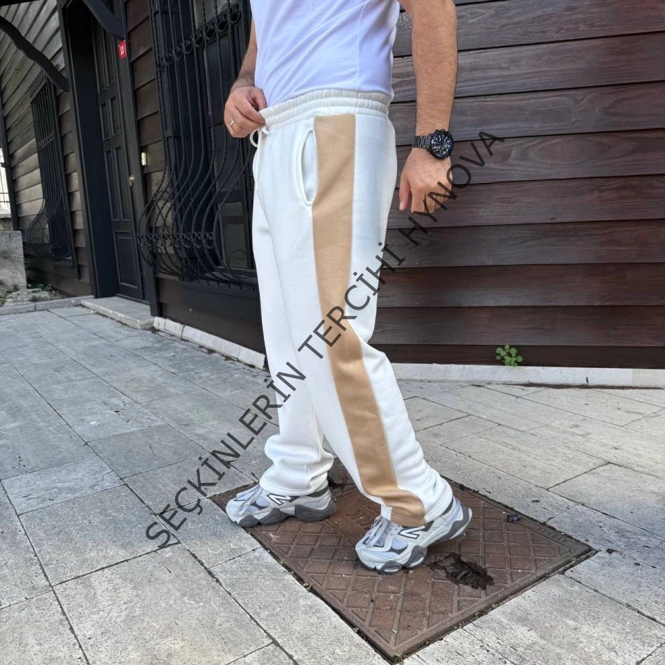 Erkek Üç İplik Kışlık Pamuklu Yandan Garneli Kalın Bej Şeritli Cepli Eşofman Altı - Beyaz