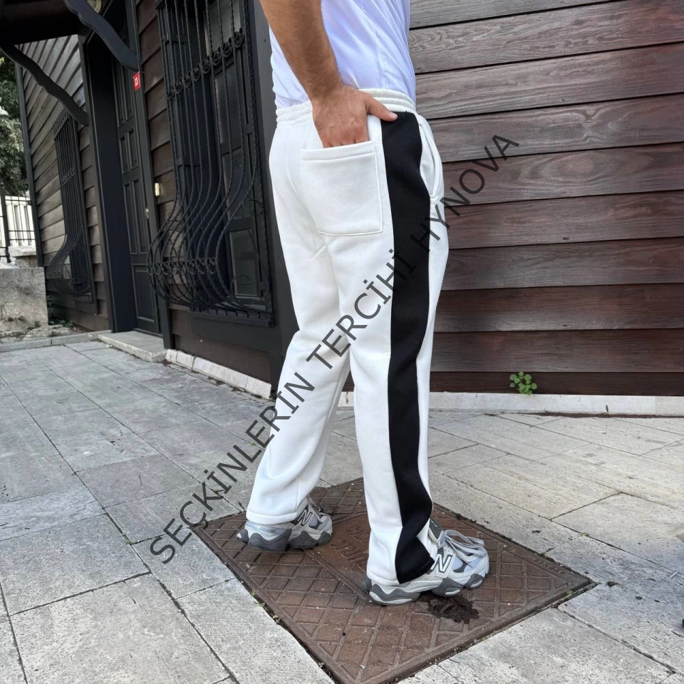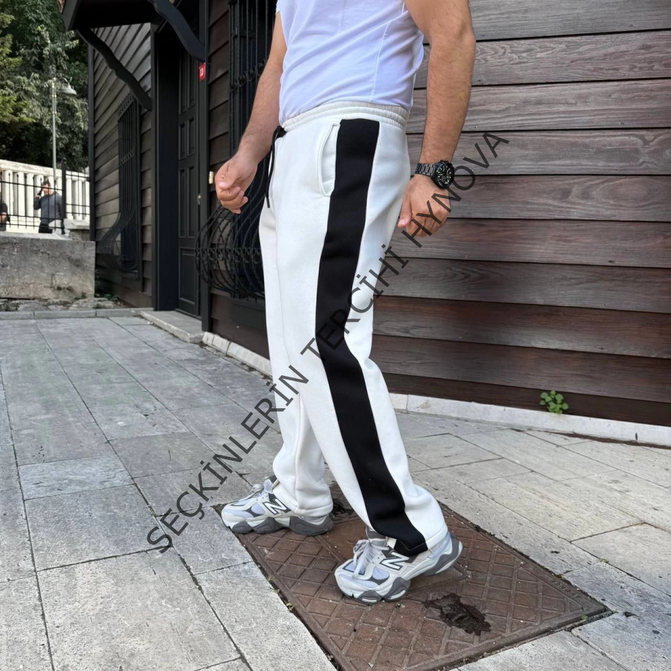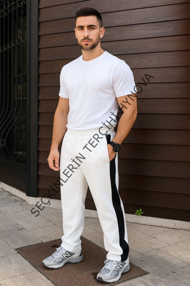 Erkek Üç İplik Kışlık Pamuklu Yandan Garneli Kalın Şeritli Cepli Eşofman Altı - Beyaz