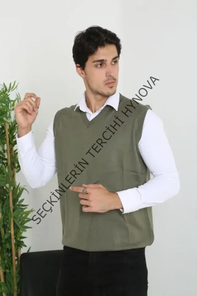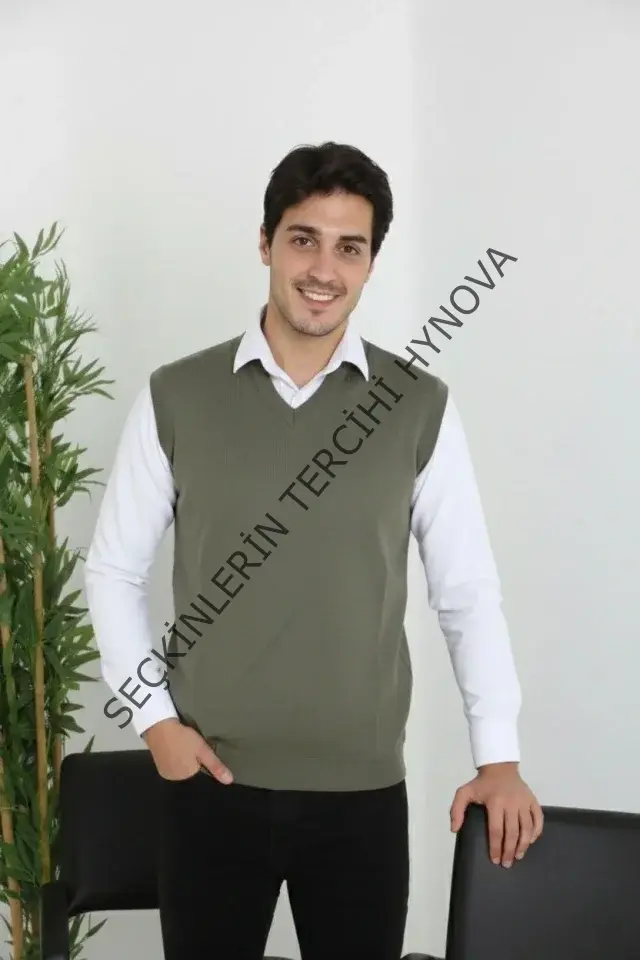 Erkek V Yaka Kolsuz Süveter Triko Kazak Yumuşak Dokulu Pamuklu Ince Dokuma Rahat Regular Kalıp - Haki