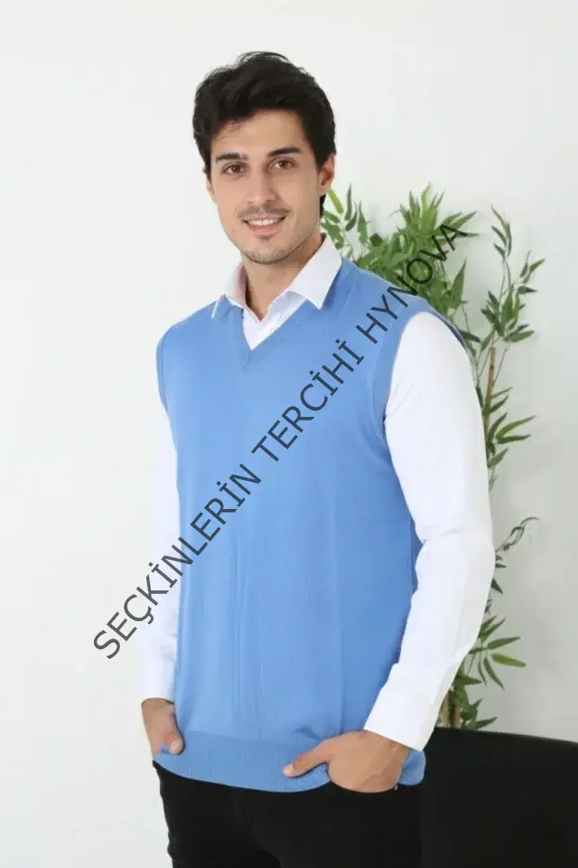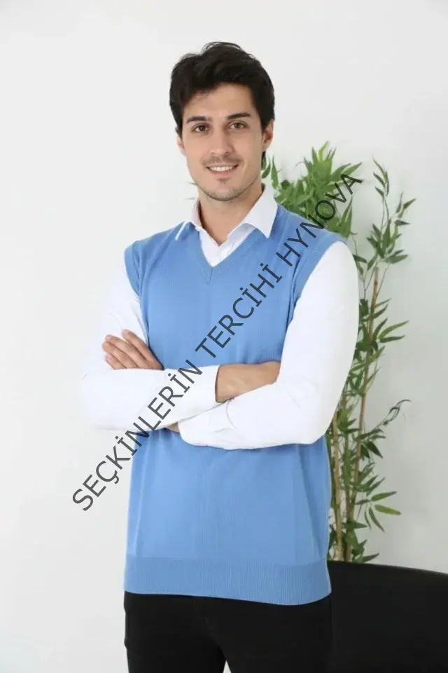 Erkek V Yaka Kolsuz Süveter Triko Kazak Yumuşak Dokulu Pamuklu Ince Dokuma Rahat Regular Kalıp - Mavi