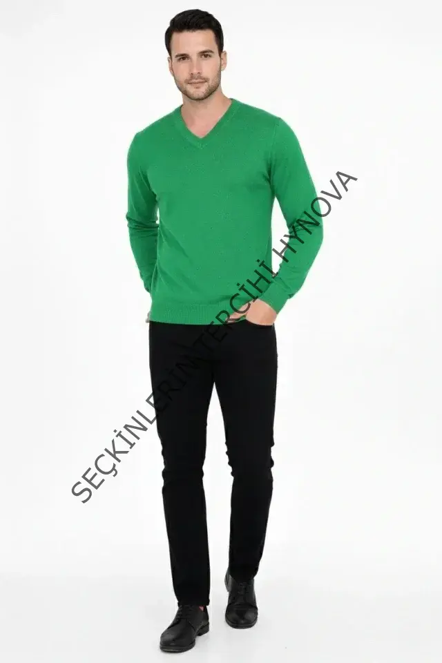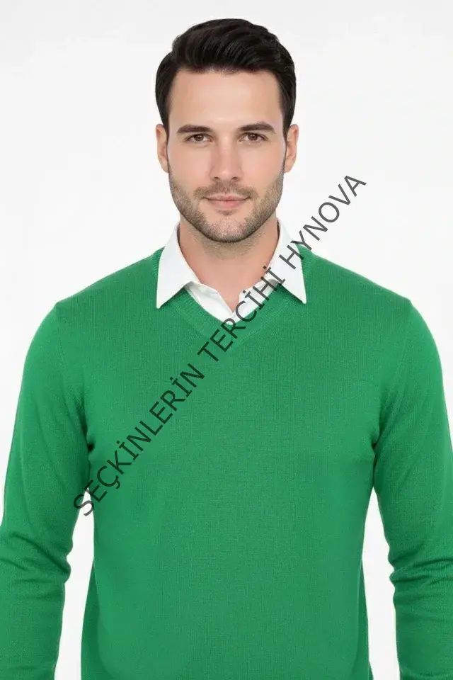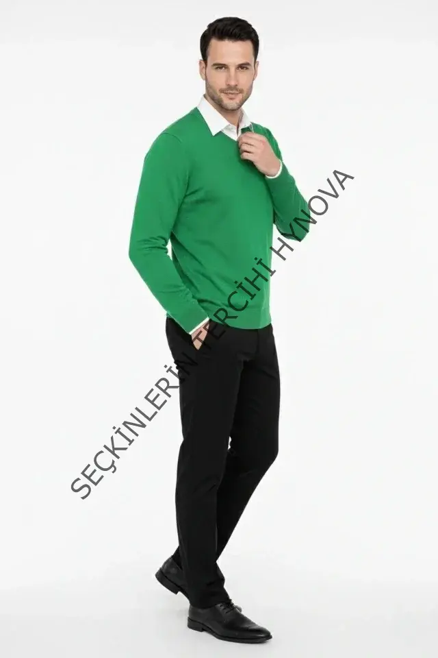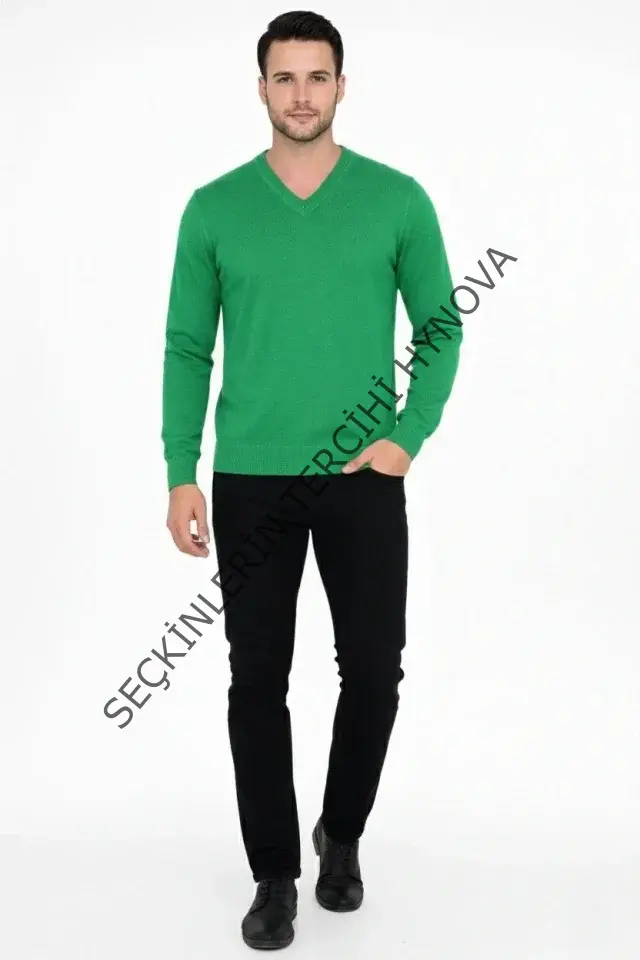 Erkek V Yaka Triko Kazak Yumuşak Dokulu Pamuklu Ince Dokuma, Uzun Kollu Rahat Regular Kalıp - Çimen Yeşili