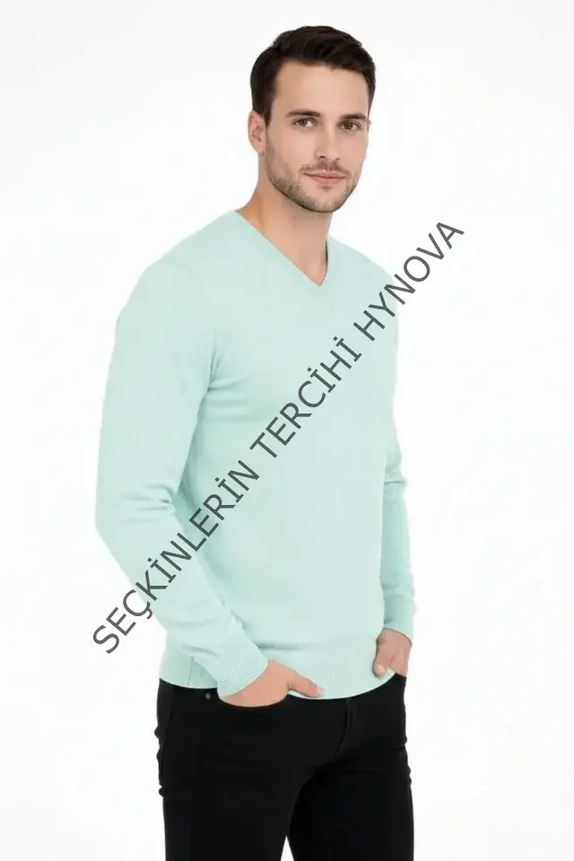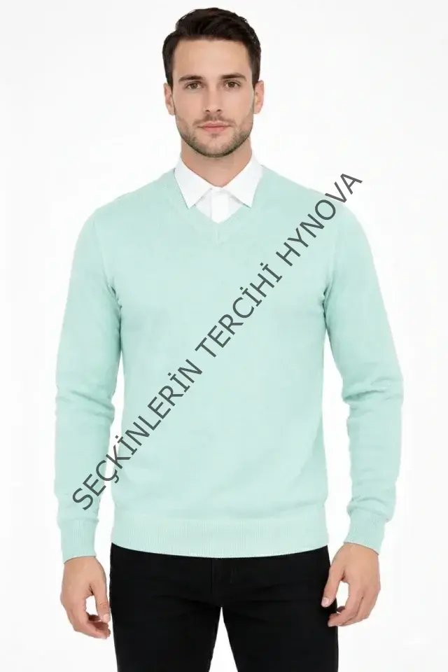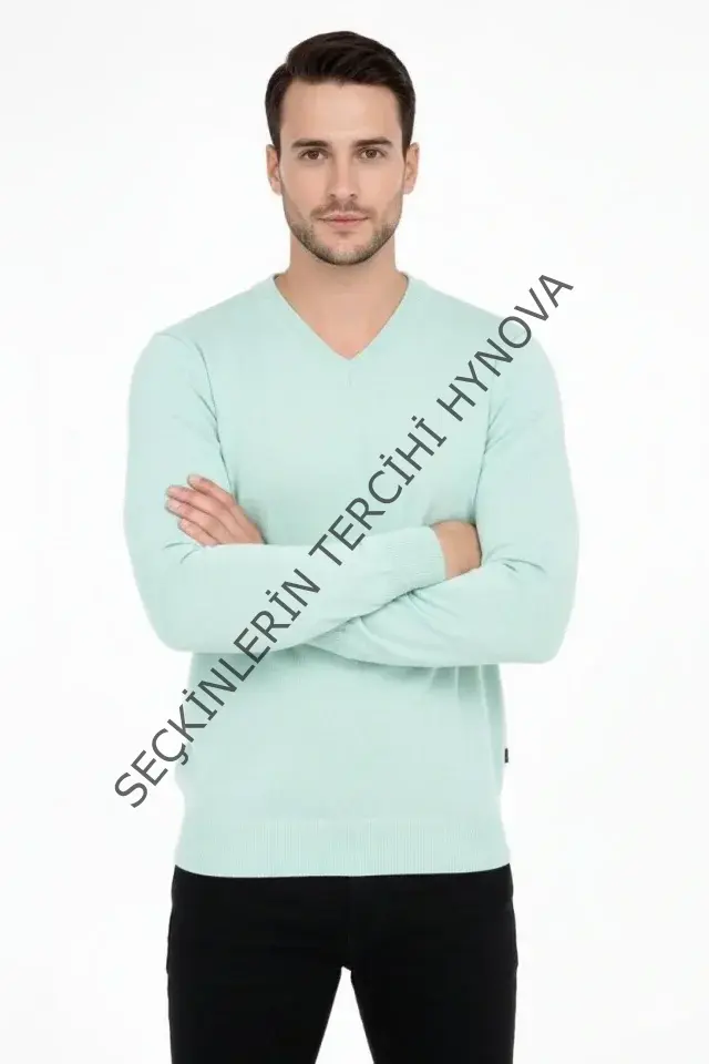 Erkek V Yaka Triko Kazak Yumuşak Dokulu Pamuklu Ince Dokuma, Uzun Kollu Rahat Regular Kalıp - Mint Yeşili