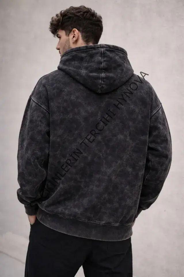 Erkek Yağ Yıkamalı Kapşonlu Double Oversize Üç İplik Pamuklu Sweatshirt - Siyah