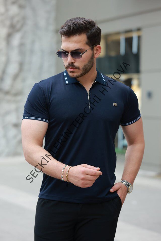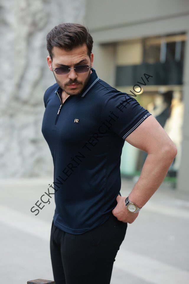 Erkek Yaka Ve Kolları çizgi Detaylı Fermuar Yakalı Kısa Kollu Tişört