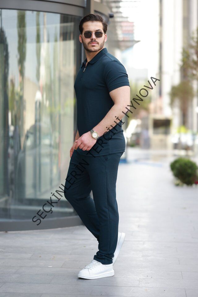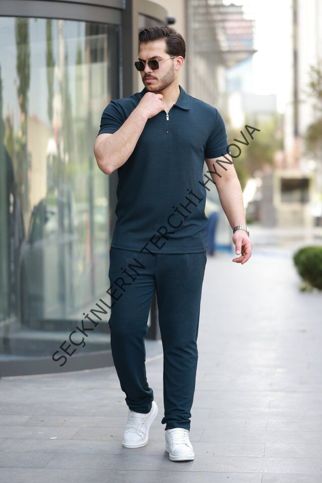 Erkek Yakalı Fermuarlı T-shirt Pantolon Ikili Rahat Takım
