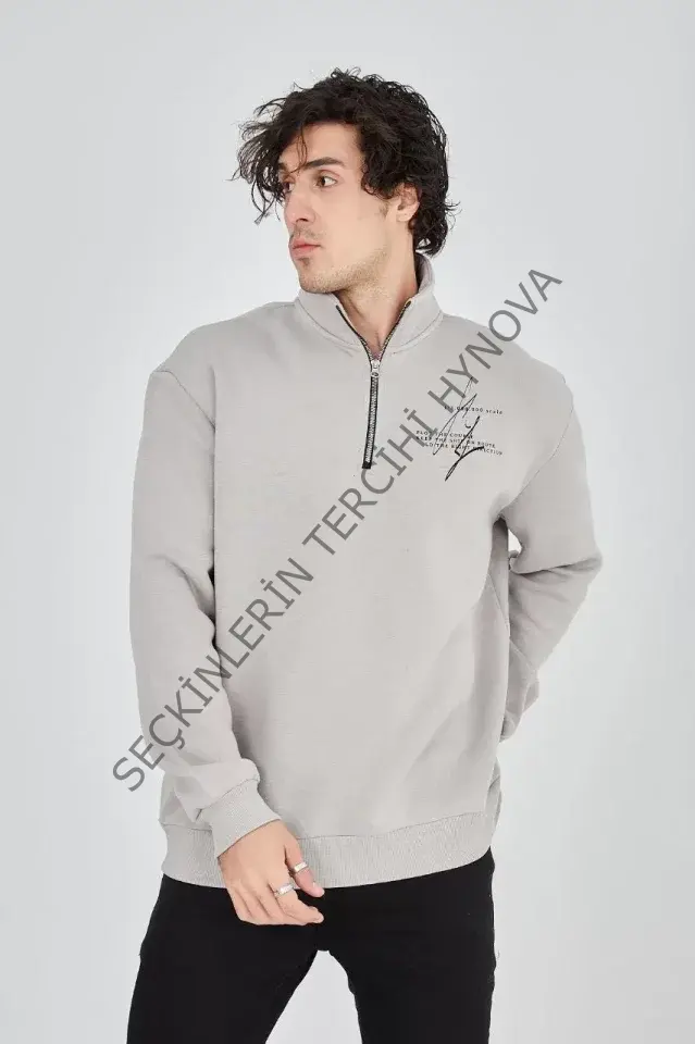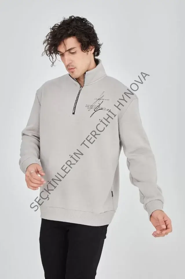 Erkek Yarım Fermuarlı Baskılı Sweat - Boyalı Gri