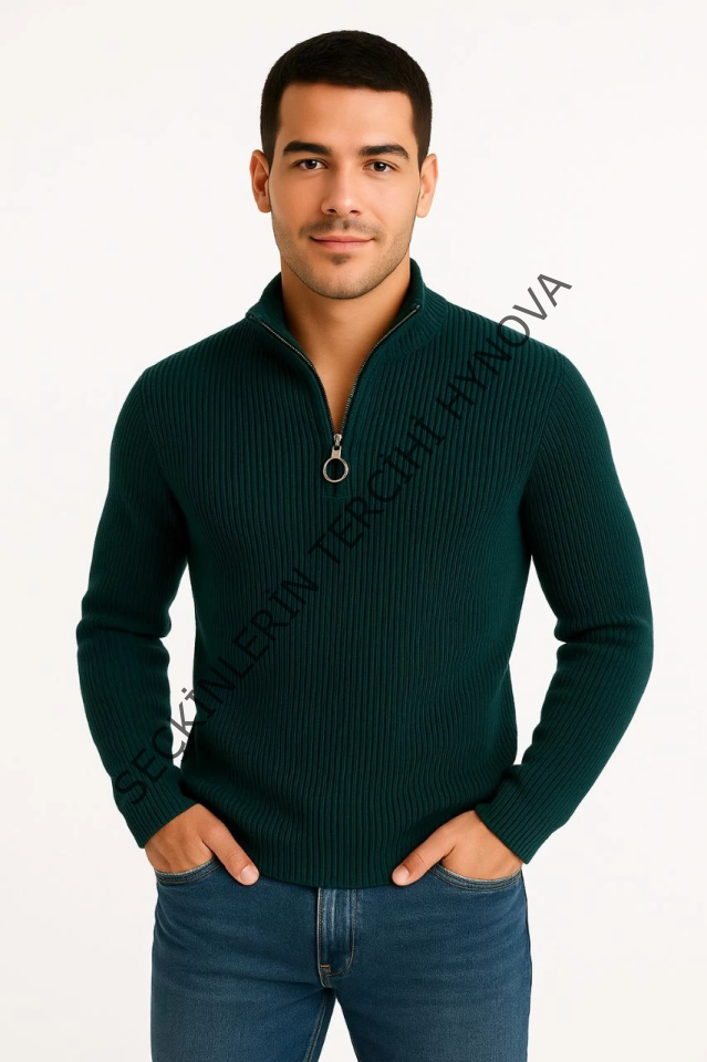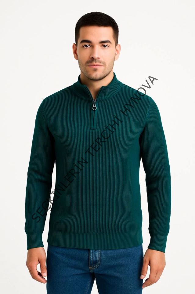 Erkek Yarım Fermuarlı Triko Kazak – Selanik Örgü, Dik Yaka, Pamuklu Dokuma, Regular Fit Uzun Kollu Kışlık Model - Haki