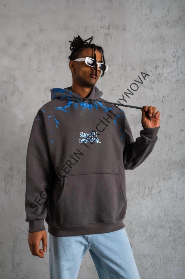 Erkek Yıldırım Baskılı Kapşonlu Sweatshirt - Gri
