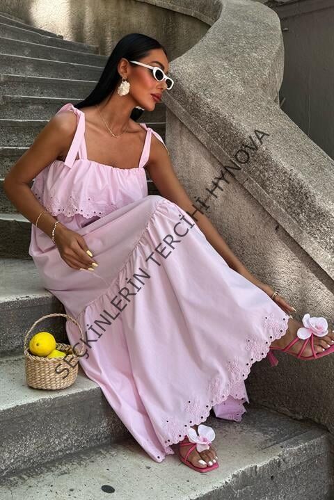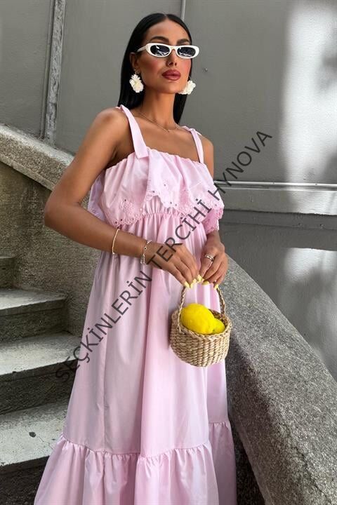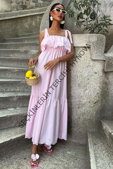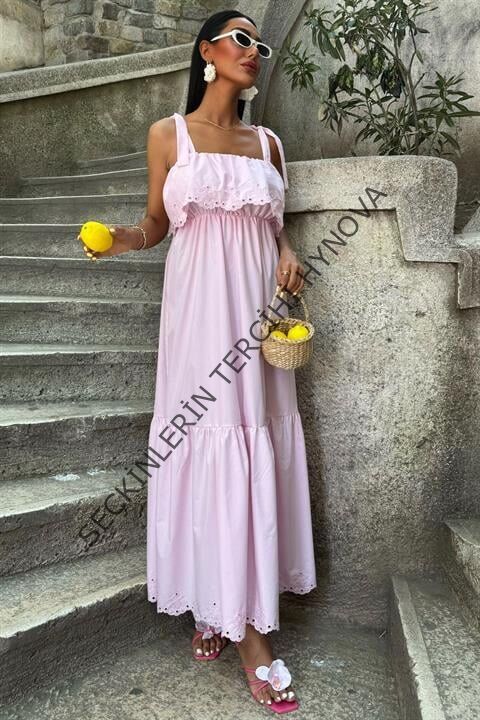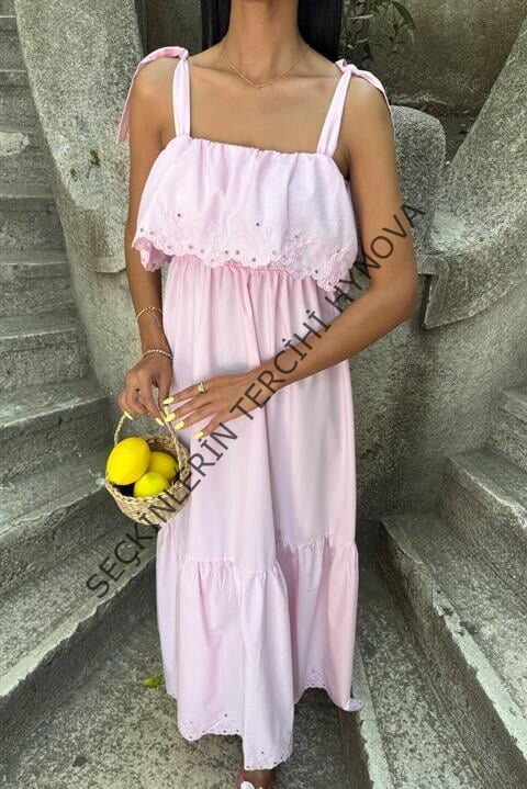 Etek Ucu Brode Nakışlı Boyundan Bağlamalı Elbise 2881