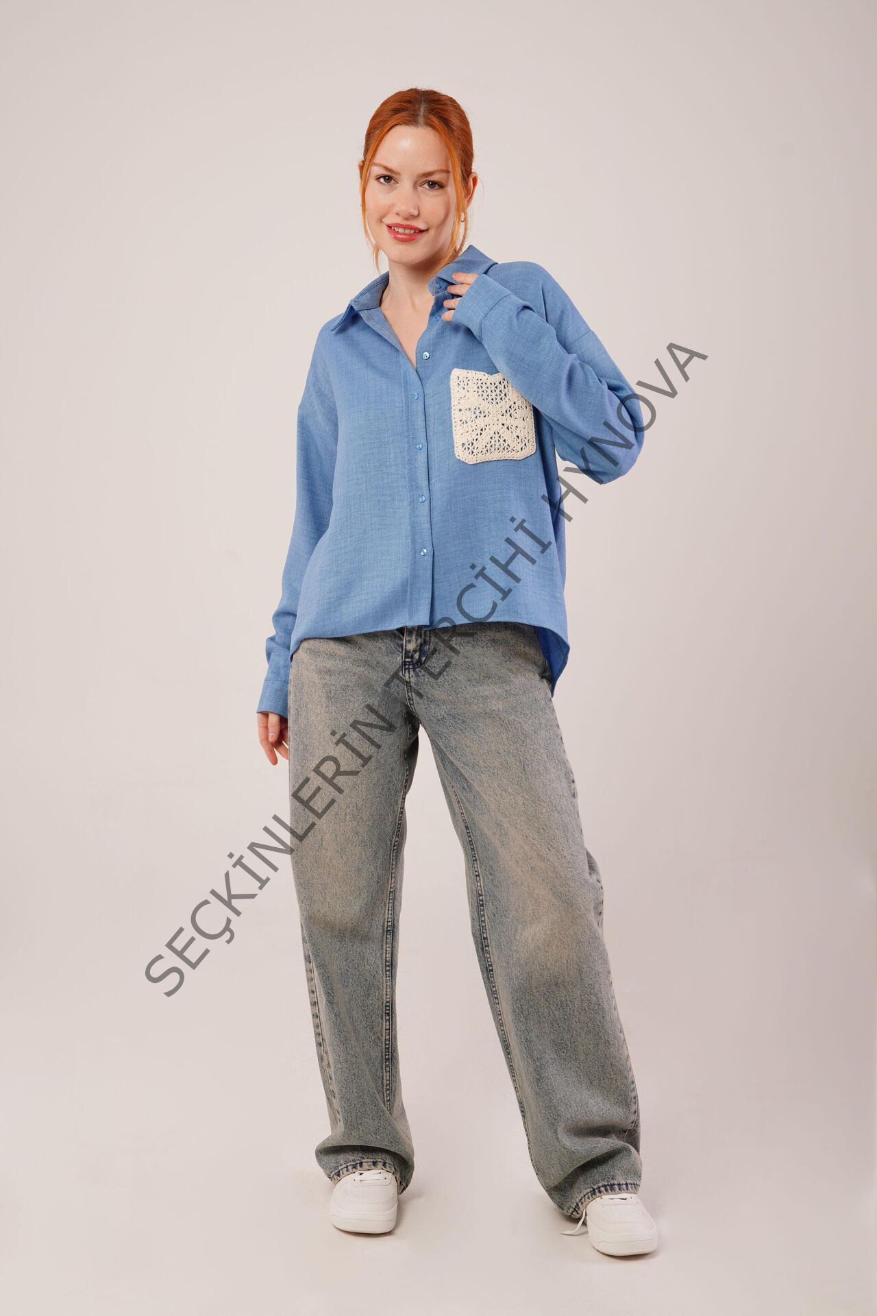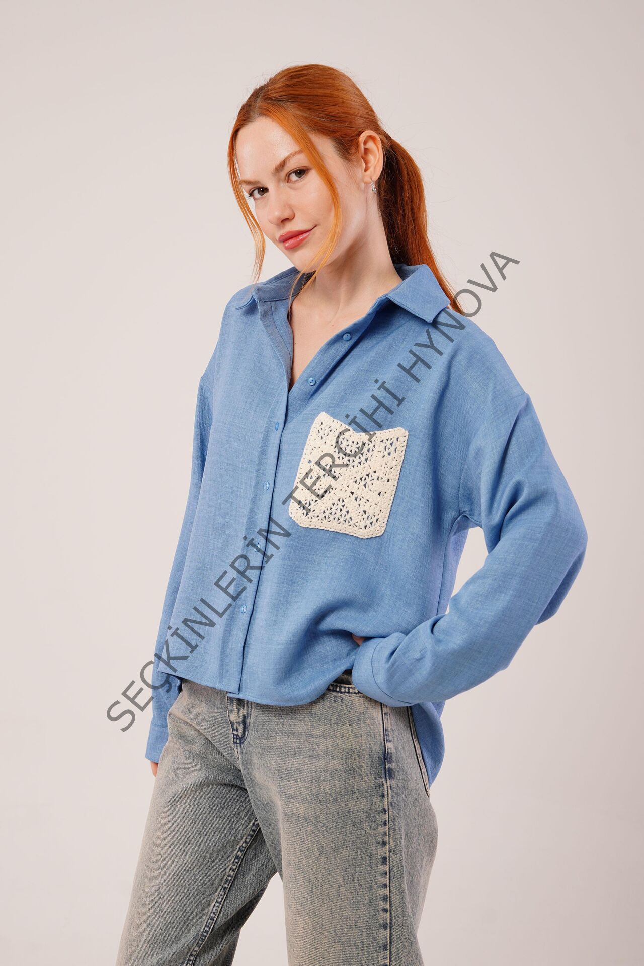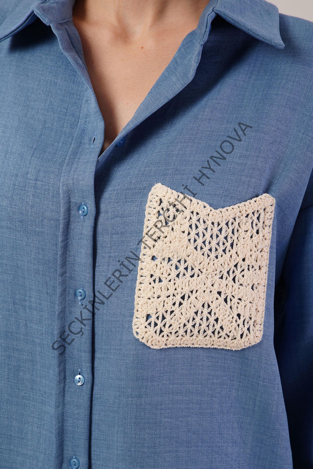 Etnik Cep Detaylı Mavi Gömlek