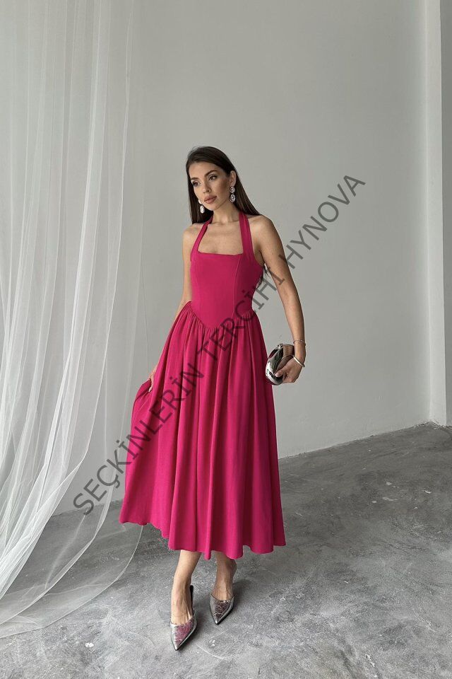 Fuşya Boyundan Bağlamalı Keten Elbise