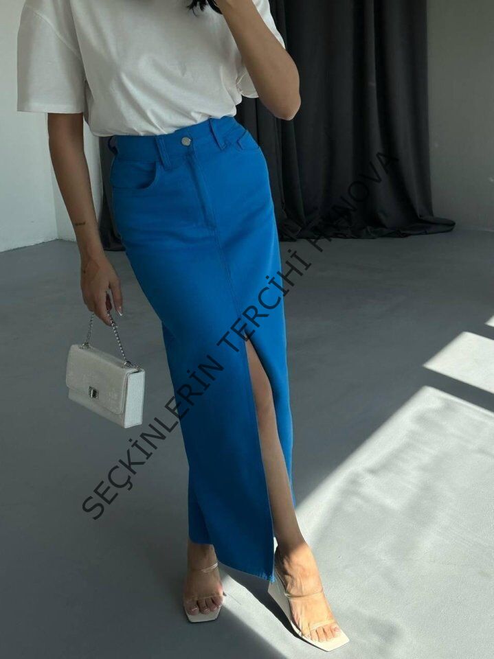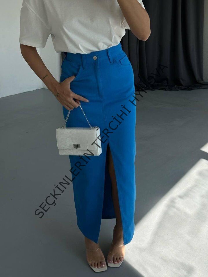 GABARDİN UZUN ÖNDEN YIRTMAÇLI ETEK - Saks
