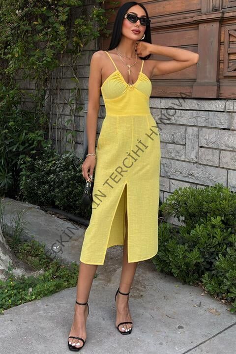 Göğsü Aksesuarlı Önü Yırtmaçlı Elbise 2899