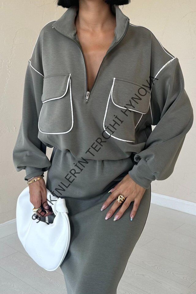 Haki Biyeli Sweatshirt Ve Etek Takım