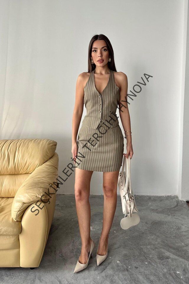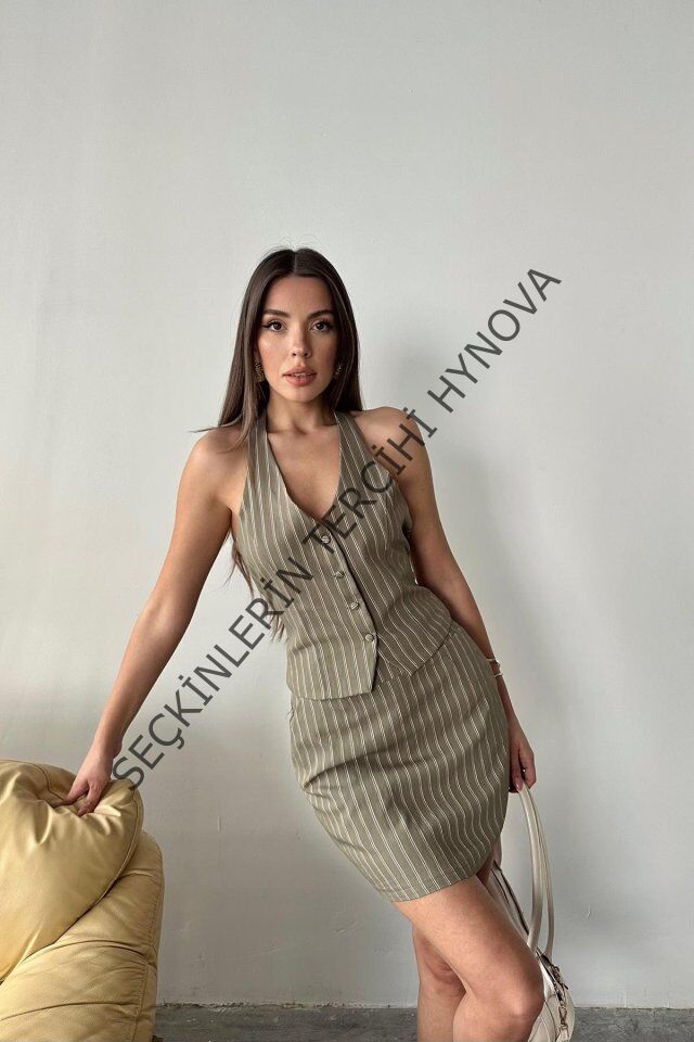Haki Çizgili Yelek Ve Etek Takım
