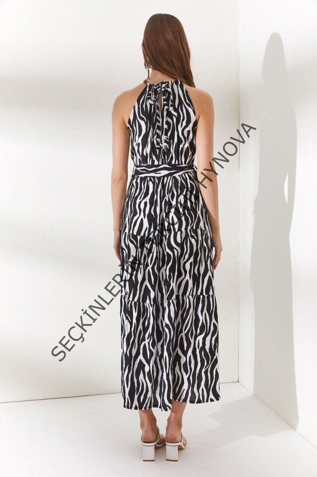 Halter Yaka Kuşaklı Dokuma Viscon Elbise