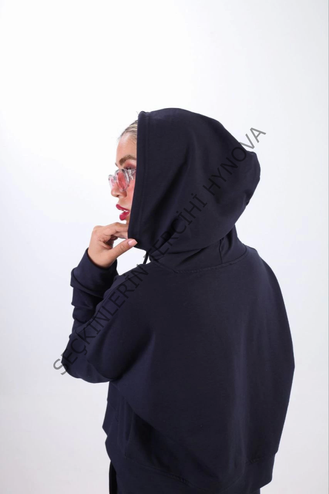 Iki Iplik Kapüşonlu Fermuarlı Crop Oversize Hırka Takım- Lacivert
