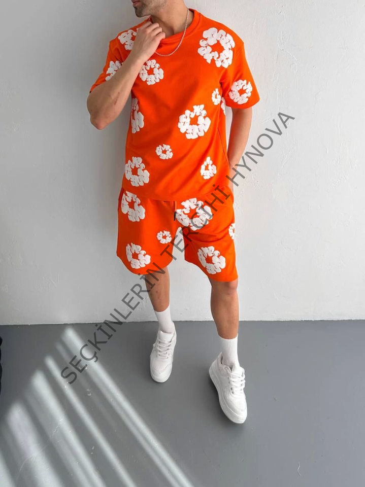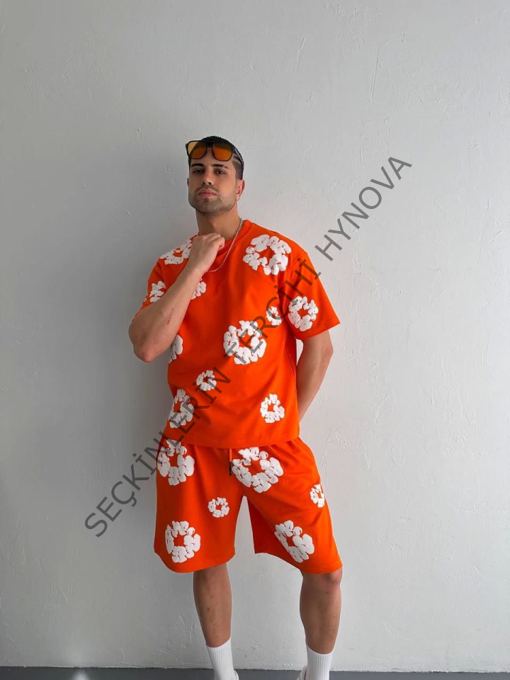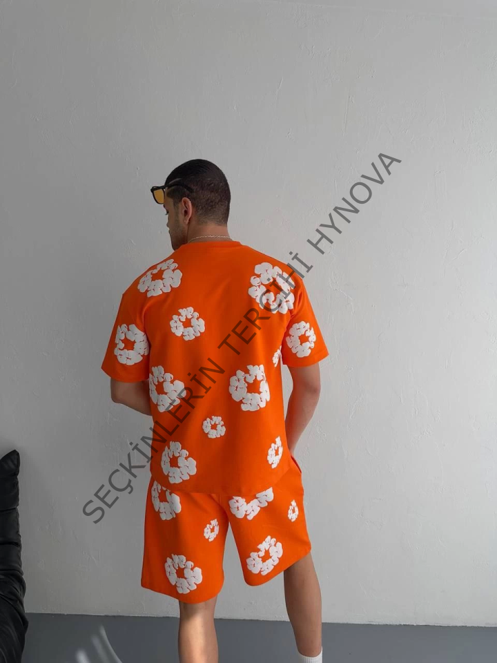 İki İplik Kumaş Baskılı T-shirt Şortlu Takım- Turuncu
