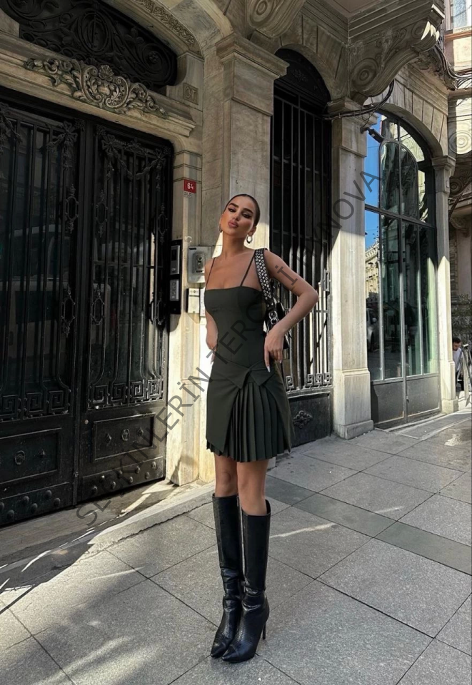 İki Parçalı Pileli Askılı Mini Elbise - Haki