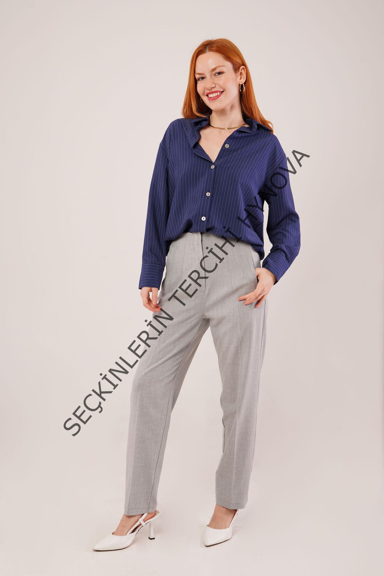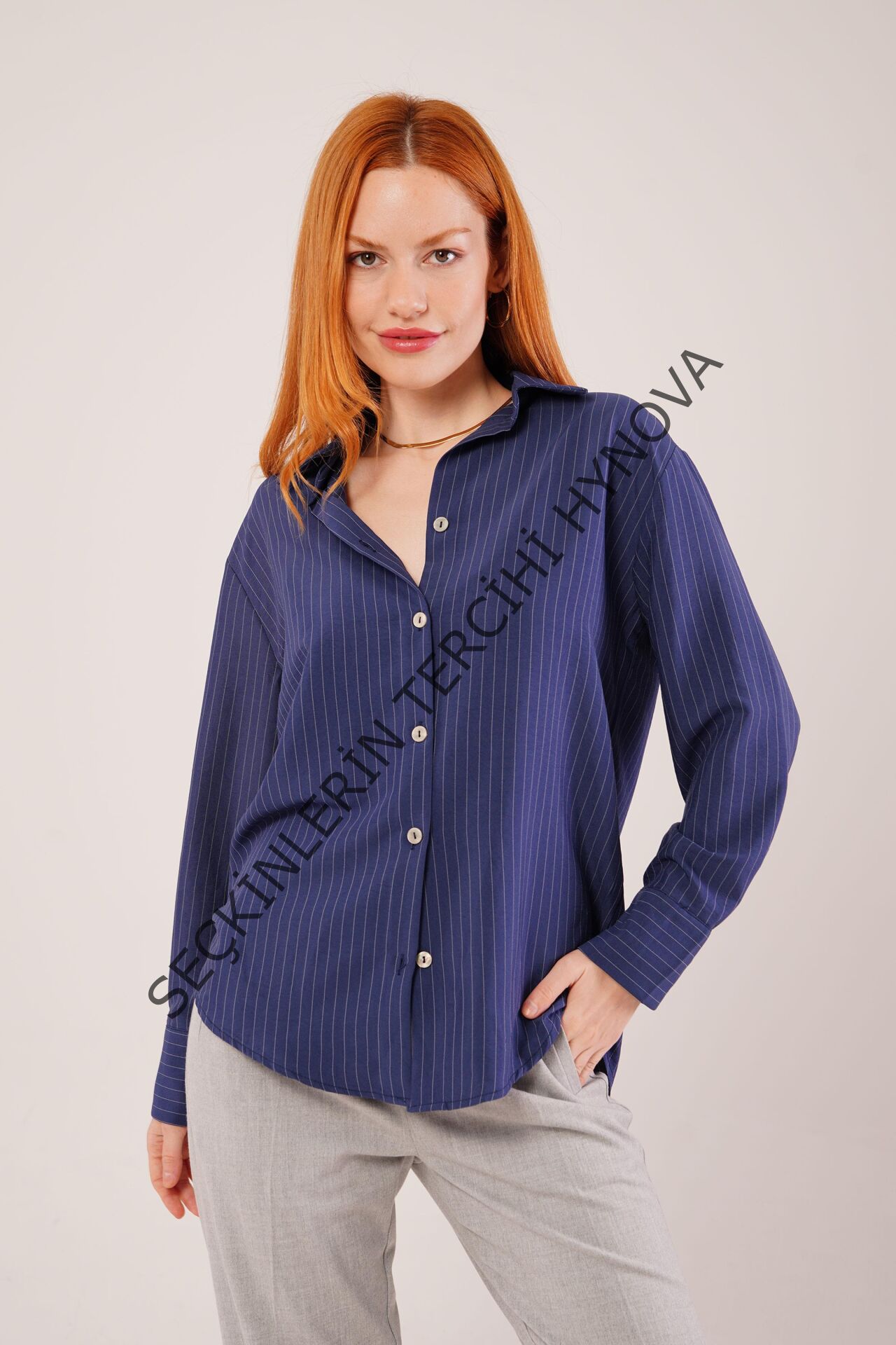 İnce Çizgi Detaylı Lacivert Gömlek