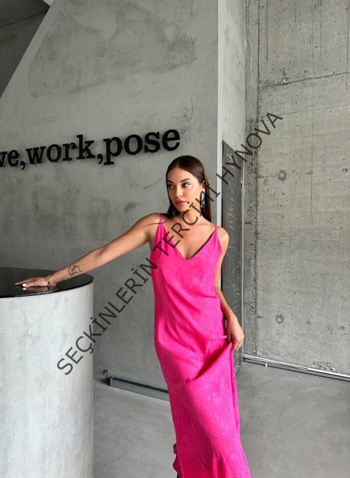 JAKARLI ASKILI SATEN ELBİSE ASİMETRİK - Pembe