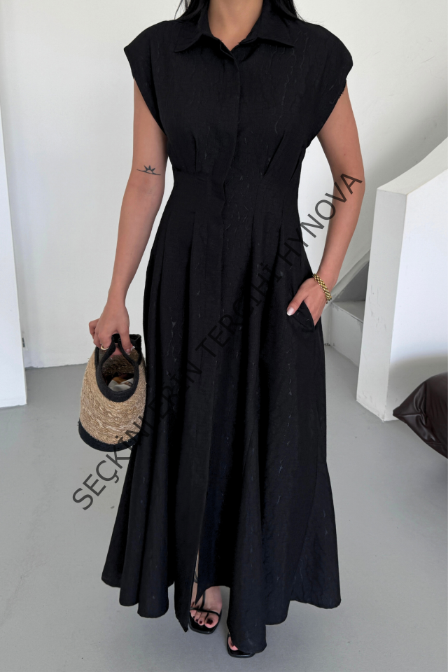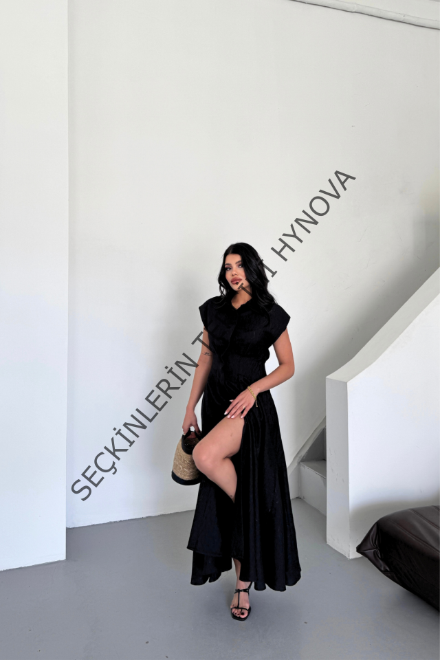 JAKARLI KETEN ELBİSE ÖNDEN YIRTMAÇLI CEPLİ - Siyah