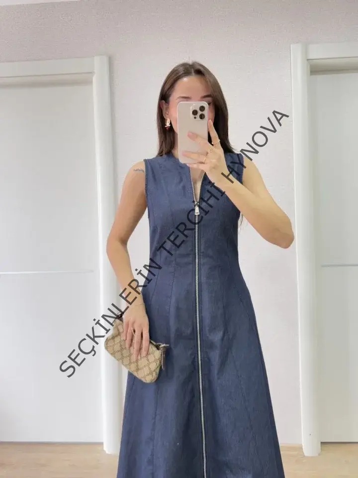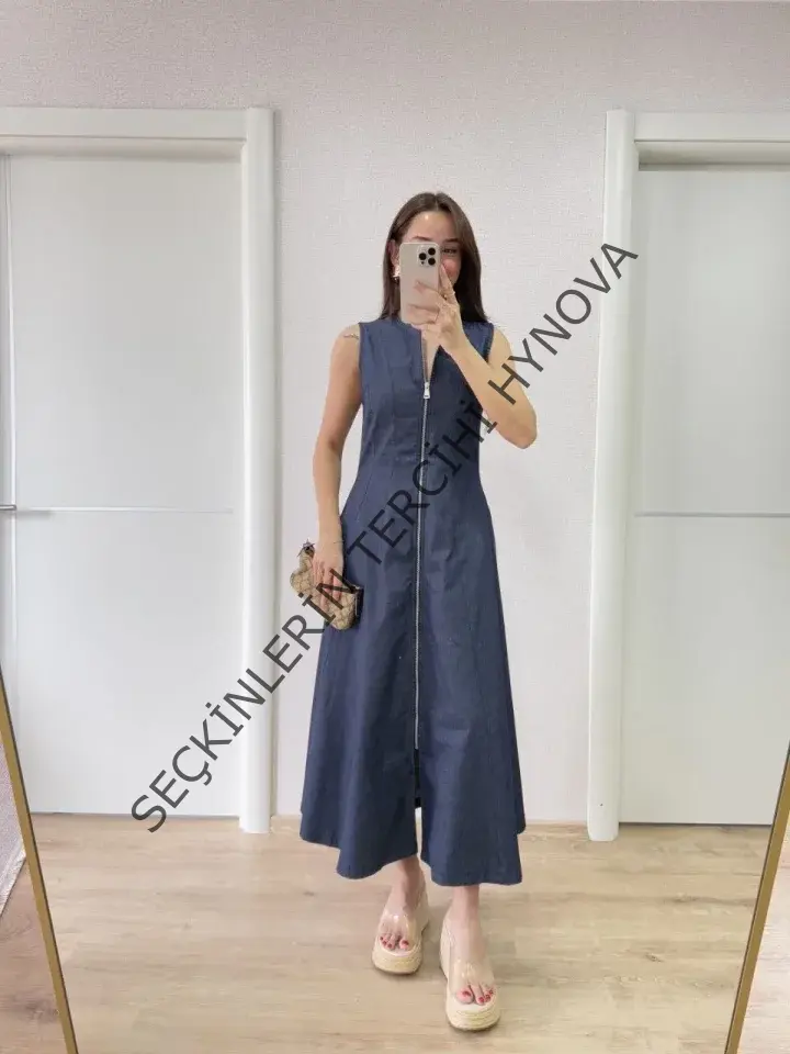 Jeans Kot Önü Tam Fermuarlı Uzun Elbise - Mavi