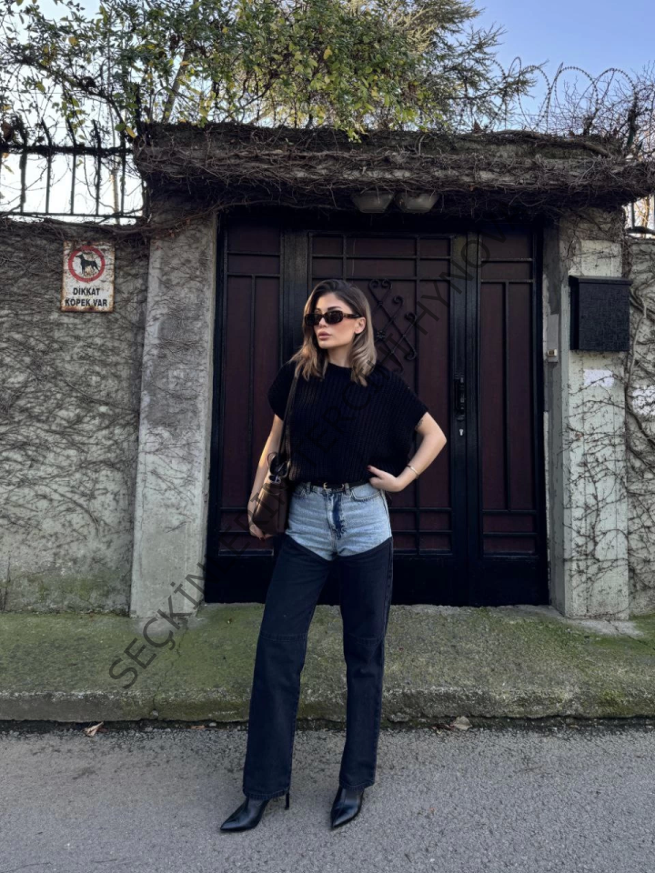 Jeans Kot Parçalı Palazzo Pantolon - Siyah