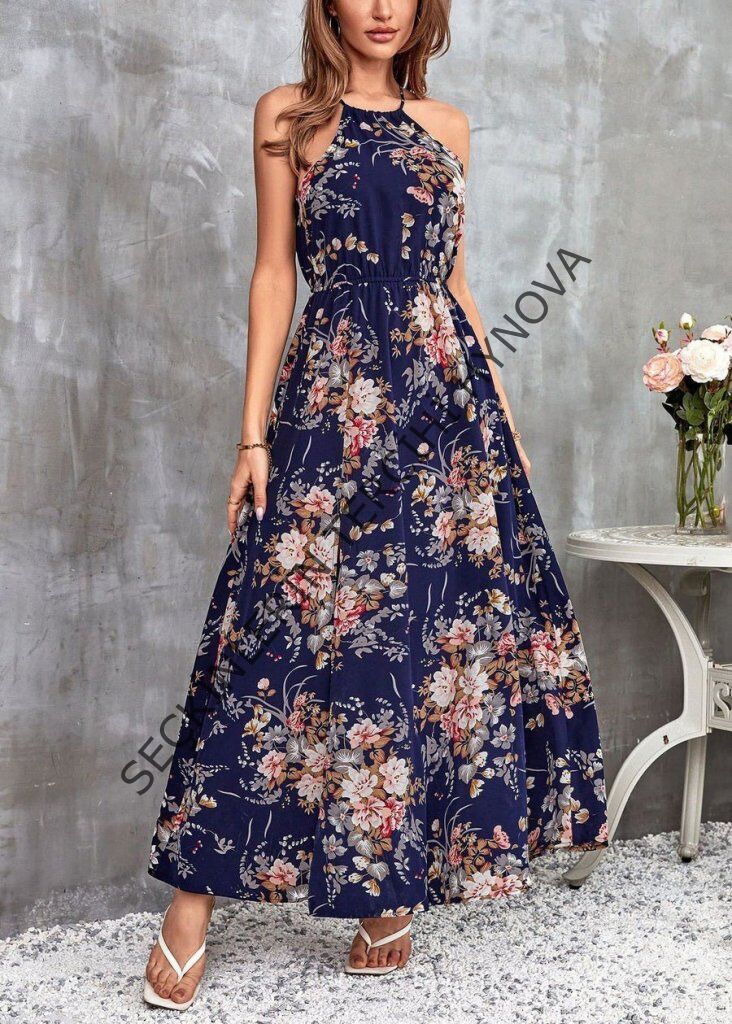 Kadın Açık Omuz Halter Yaka Beli Lastikli Büzgü Detay önden Yırtmaçlı çiçek Desenli Süprem Elbise