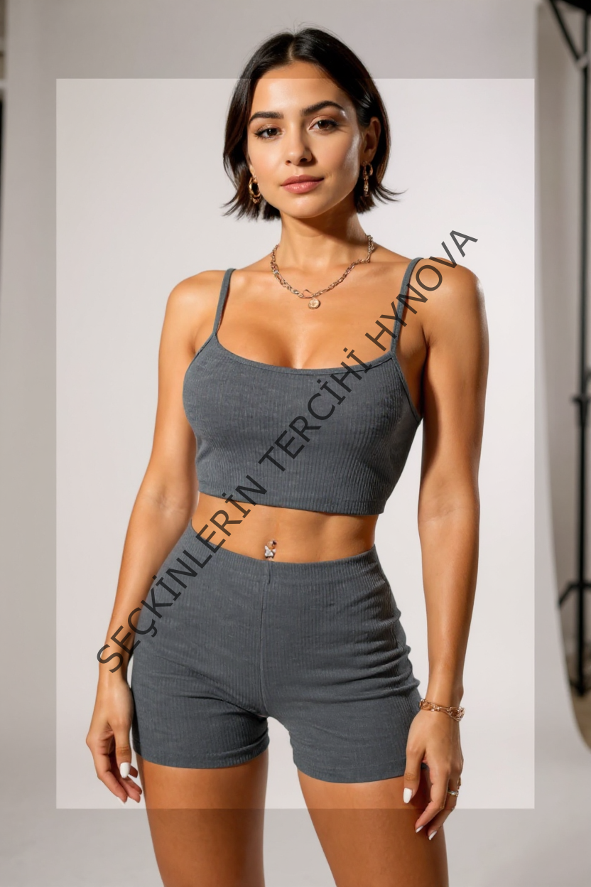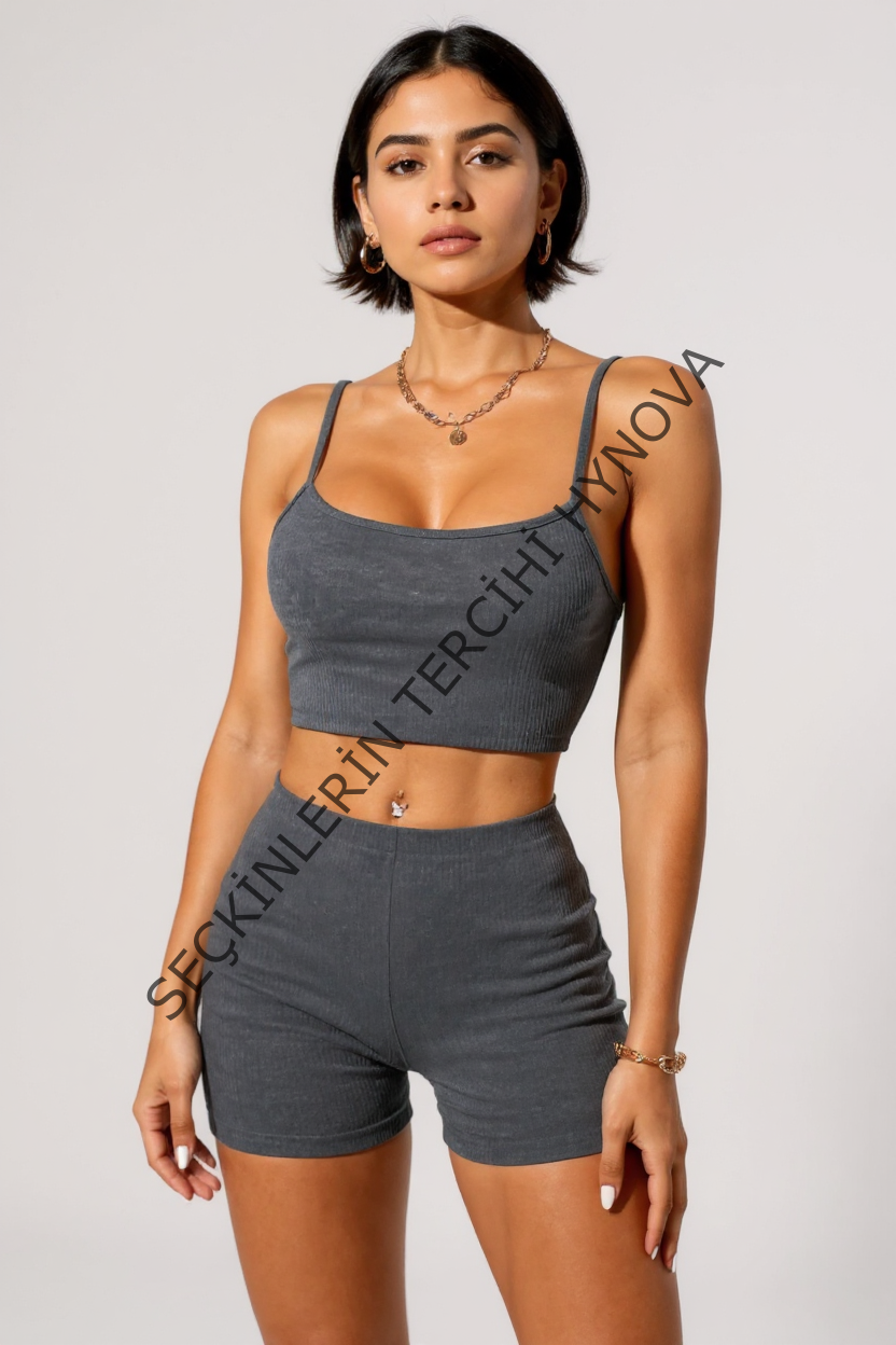 Kadın Antrasit Gri Şortlu Kaşkorse Gecelik Takım – Modern, Konforlu ve Günlük Kombinlere Uygun