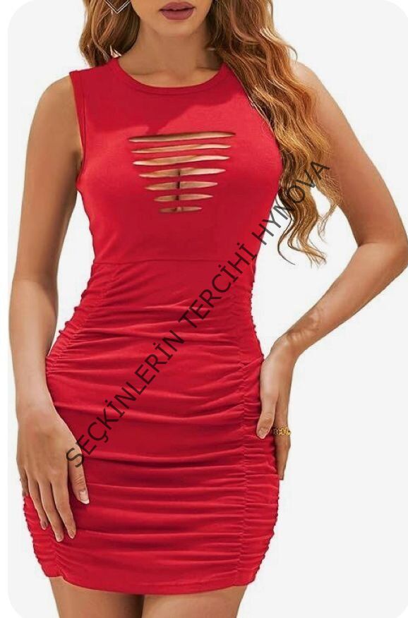 Kadın Askılı Bisiklet Yaka Lazer Dekolte Detaylı Kısa Janjan Krep Elbise