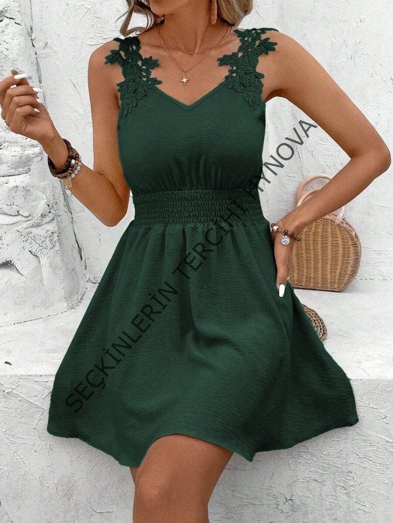 Kadın Askılı Dantel Detaylı Beli Büzgülü Aerobin Elbise