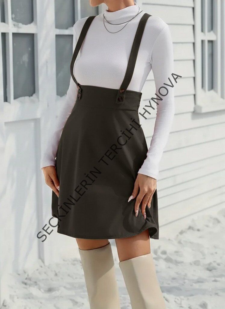 Kadın Askılı Düğmeli Mini Süet Elbise