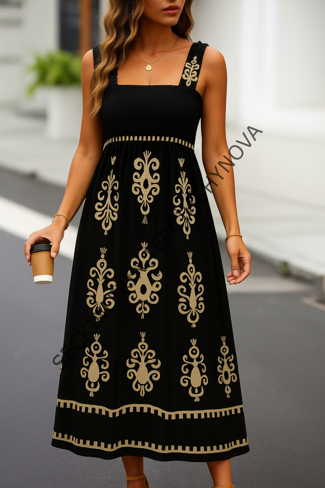 Kadın Askılı Kare Yaka Gipe Detaylı Desenli Suprem Elbise