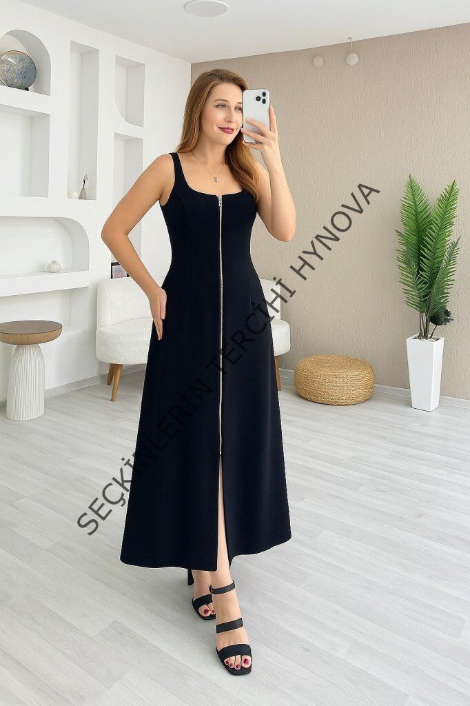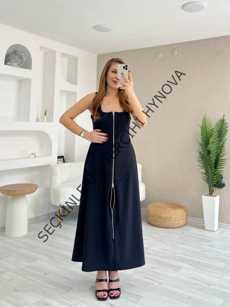 Kadın Askılı Kare Yaka önden Fermuarlı Geniş Kesim Janjan Krep Elbise