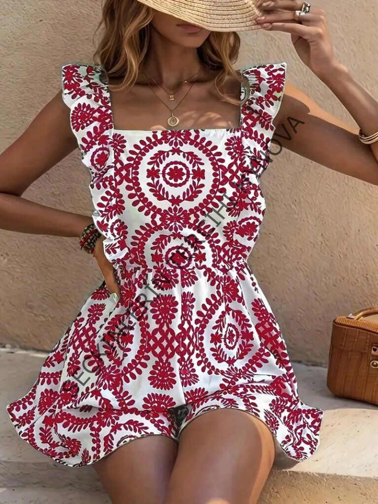 Kadın Askılı Kare Yakalı Arkadan Bağcıklı Desenli Keten Tulum