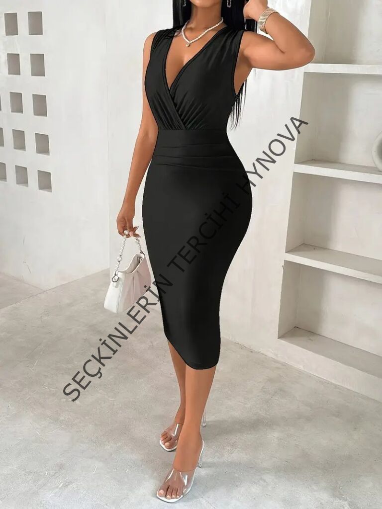 Kadın Askılı Kruvaze Yakalı Dalgıç Midi Elbise