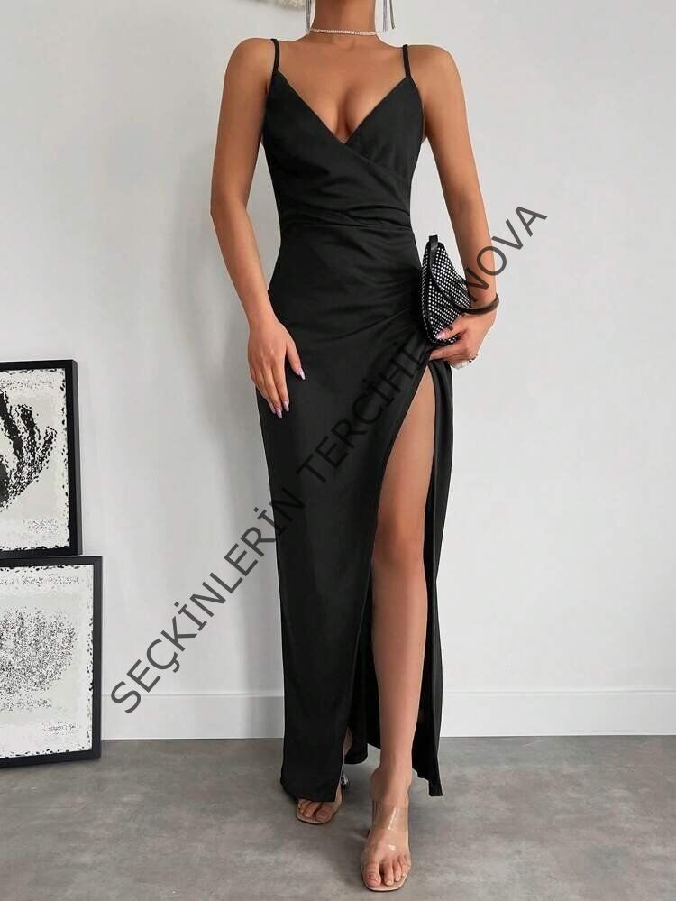 Kadın Askılı Kruvaze Yakalı Yırtmaçlı Krep Elbise
