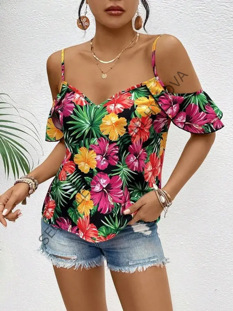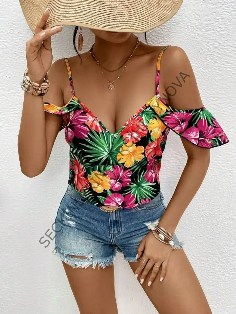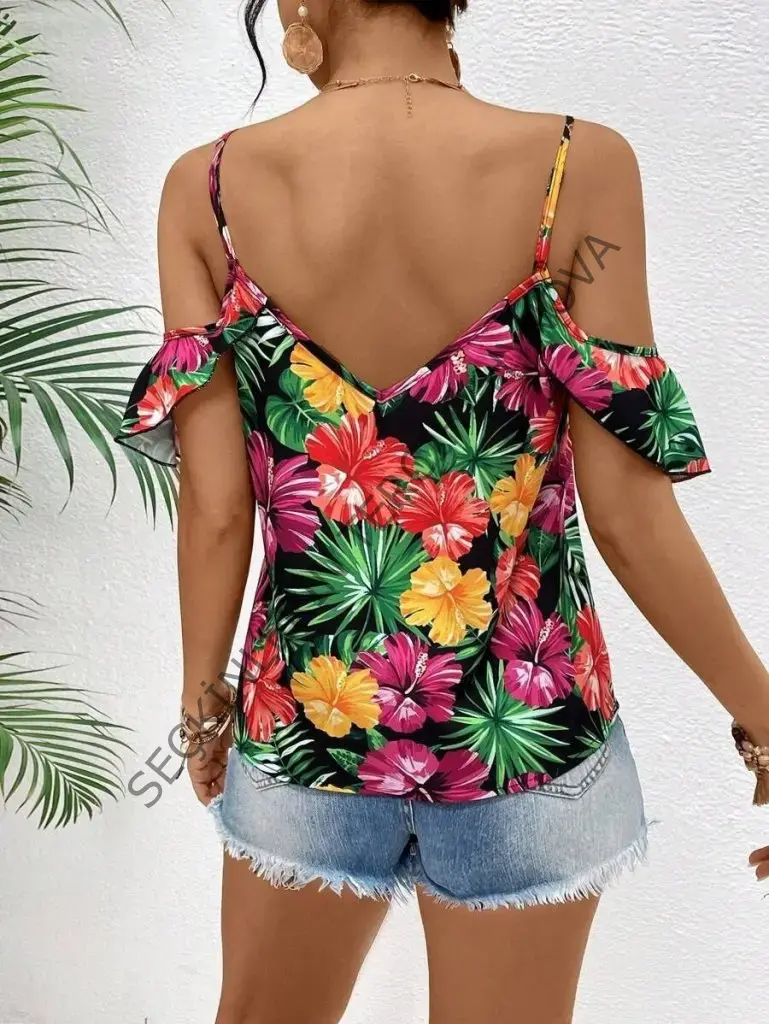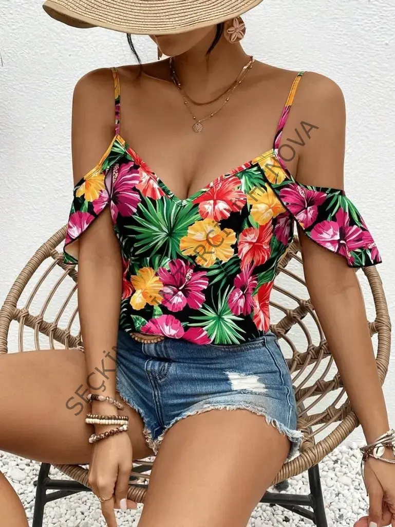 Kadın Askılı Omuzlardan Açık çiçek Baskılı Bluz