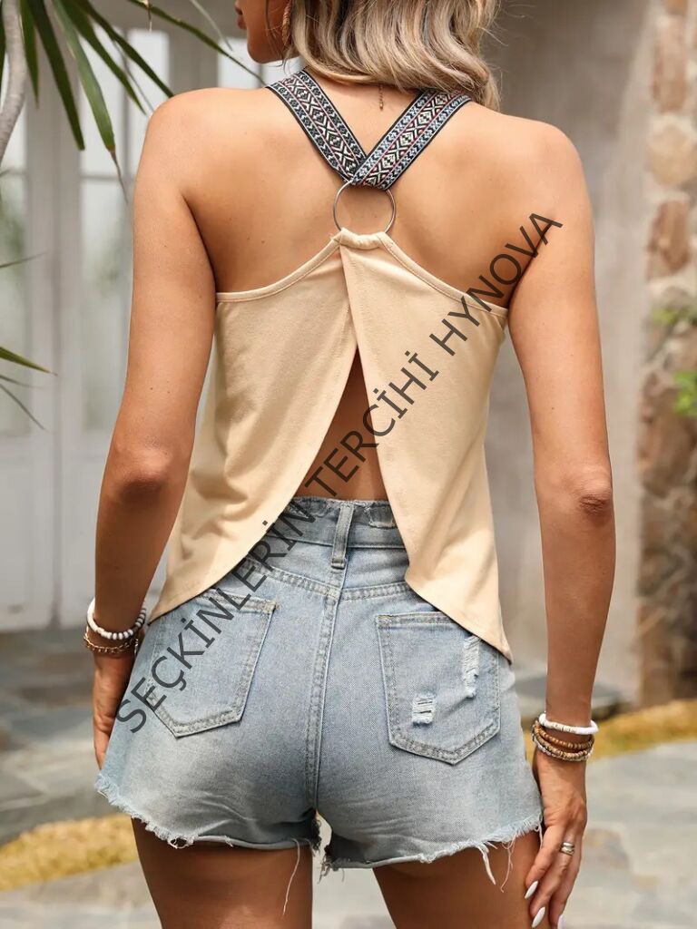 Kadın Askılı V Yakalı Arkadan Halka Detaylı Viskon Bluz