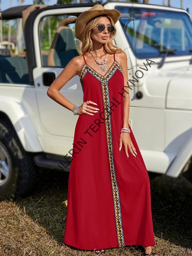 Kadın Askılı V Yakalı Etnik şerit Detaylı Uzun Viskon Elbise