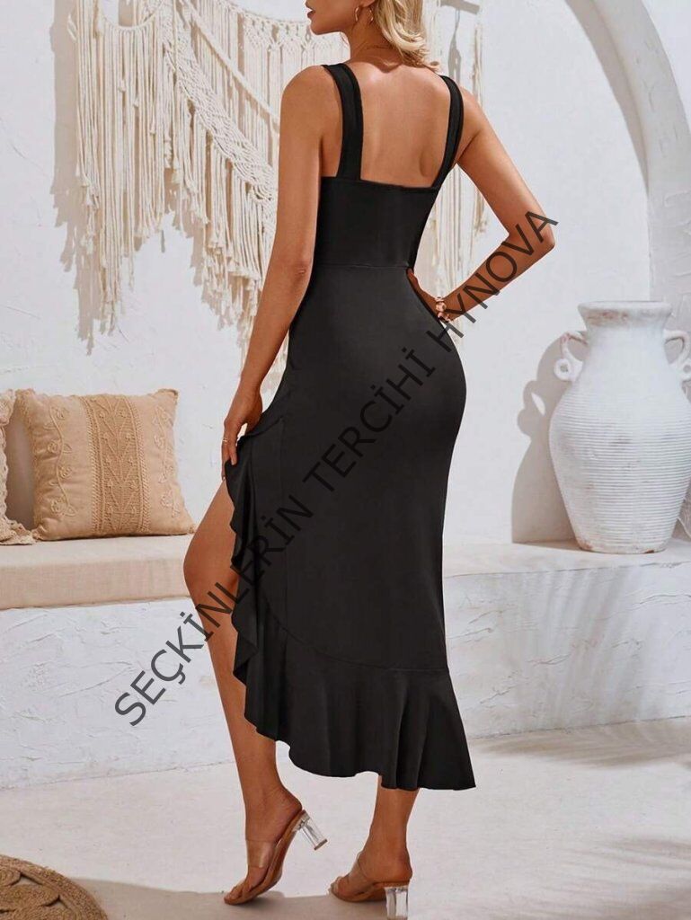 Kadın Askılı V Yakalı önden Fırfırlı Uzun Dalgıç Elbise